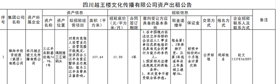 四川越王樓文化傳播有限公司資產(chǎn)出租公告