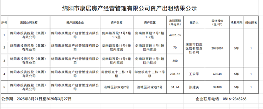 綿陽(yáng)市康居房產(chǎn)經(jīng)營(yíng)管理有限公司資產(chǎn)出租結(jié)果公示