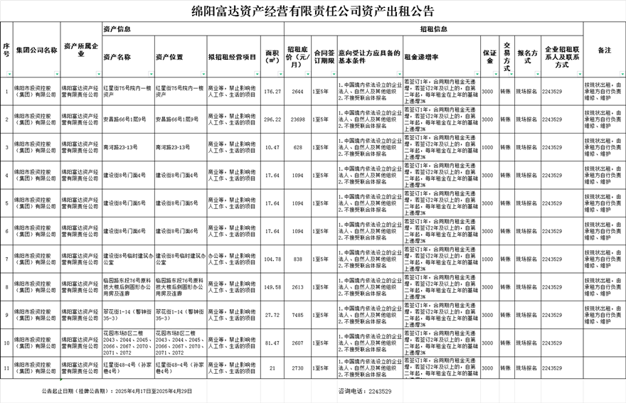 綿陽富達(dá)資產(chǎn)經(jīng)營有限責(zé)任公司資產(chǎn)出租公告