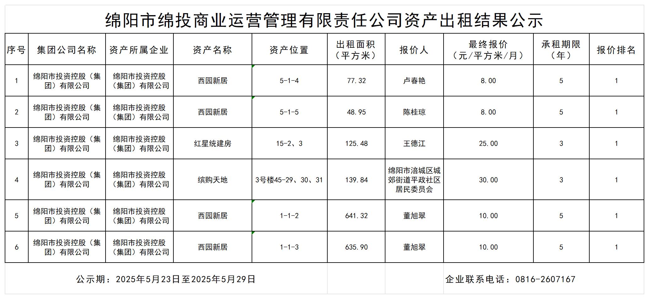 綿陽市綿投商業(yè)運(yùn)營管理有限責(zé)任公司資產(chǎn)出租結(jié)果公示