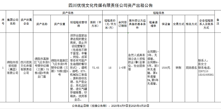 四川優(yōu)悅文化傳媒有限責任公司資產(chǎn)出租公告