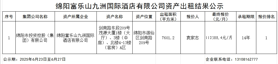 綿陽(yáng)富樂(lè)山九洲國(guó)際酒店有限公司資產(chǎn)出租結(jié)果公示