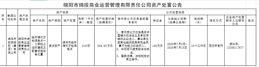 綿陽市綿投商業(yè)運(yùn)營(yíng)管理有限責(zé)任公司資產(chǎn)處置公告