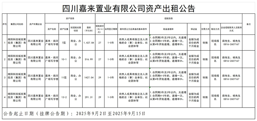四川嘉來(lái)置業(yè)有限公司資產(chǎn)出租公告