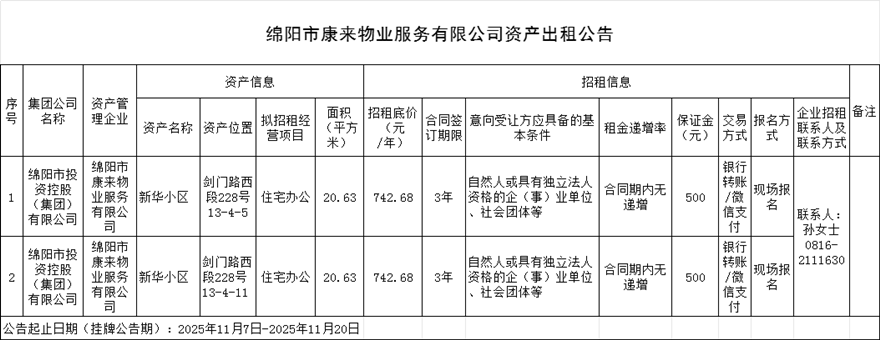 綿陽(yáng)市康來(lái)物業(yè)服務(wù)有限公司資產(chǎn)出租公告