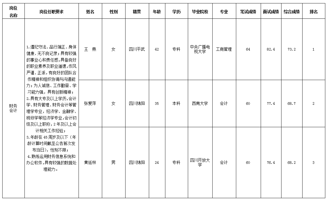 根據(jù)綿陽市綿州嘉來會務(wù)服務(wù)有限公司發(fā)布的招聘公告及招聘相關(guān)規(guī)定,經(jīng)筆試、面試等程序,現(xiàn)將筆試(面試)成績予以公示。