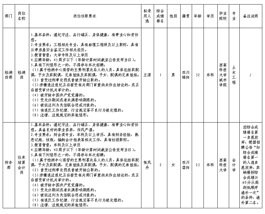 根據(jù)綿陽市建設(shè)工程質(zhì)量檢測中心有限責(zé)任公司發(fā)布的招聘公告及招聘相關(guān)規(guī)定,經(jīng)筆試、面試、背景調(diào)查、體檢等程序,擬錄用王源等同志到綿陽市建設(shè)工程質(zhì)量檢測中心有限責(zé)任公司工作,現(xiàn)予以公示,具體情況如下: