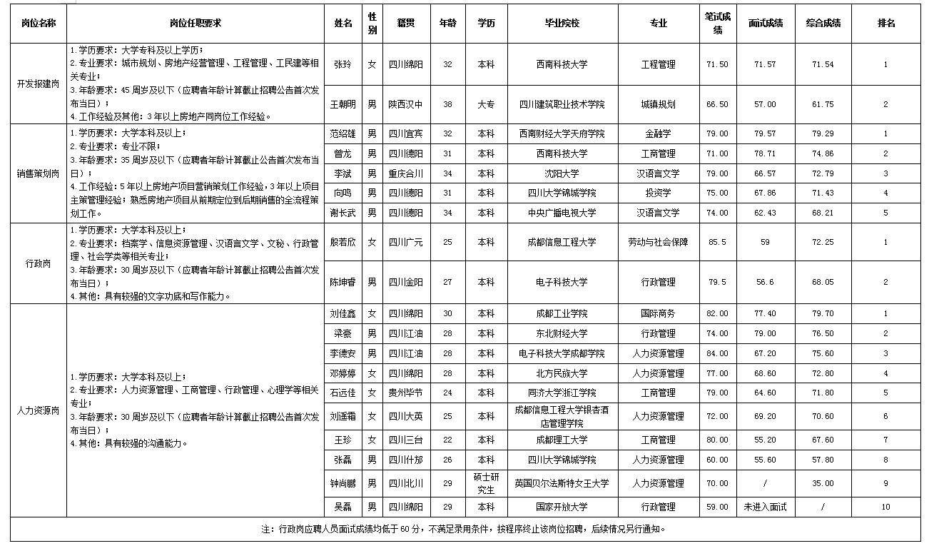 根據(jù)綿陽市綿投置地有限公司發(fā)布的招聘公告及招聘相關(guān)規(guī)定,經(jīng)筆試、面試等程序,現(xiàn)將筆試、面試成績予以公示。