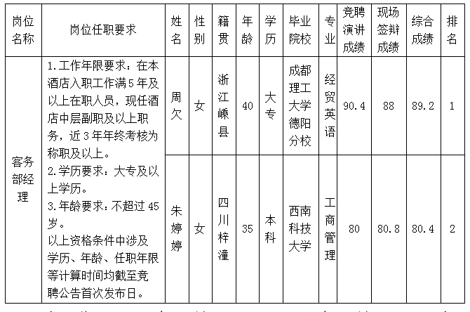 根據(jù)綿陽富樂山九洲國際酒店有限公司關(guān)于客務部經(jīng)理內(nèi)部競聘公告及招聘相關(guān)規(guī)定,經(jīng)競聘演講、現(xiàn)場答辯等程序,現(xiàn)將競聘成績予以公示。