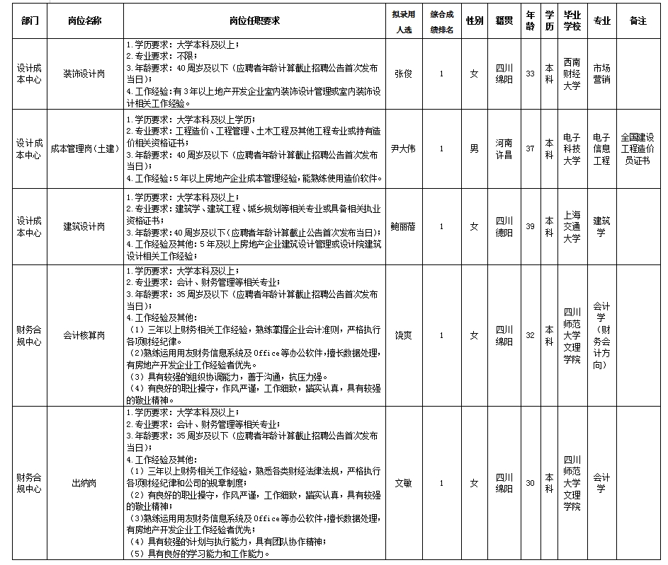 【公開招聘】綿陽市綿投置地有限公司關于裝飾設計崗等崗位擬錄用人選的公示