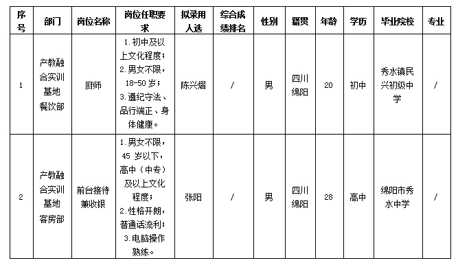根據(jù)綿陽市綿州嘉來會務服務有限公司發(fā)布的招聘公告及招聘相關(guān)規(guī)定,經(jīng)面試、體檢等程序,擬錄用陳興熠、張陽同志到產(chǎn)教融合實訓基地餐飲部、客房部工作,現(xiàn)予以公示,具體情況如下: