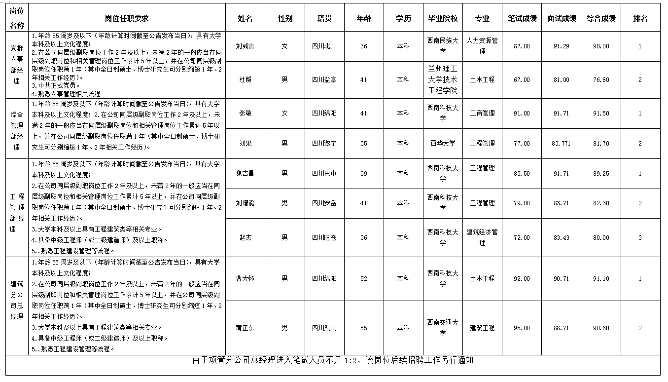 根據(jù)四川嘉來(lái)建筑工程有限公司發(fā)布的中層競(jìng)聘公告及相關(guān)規(guī)定,經(jīng)筆試、面試等程序,現(xiàn)將綜合成績(jī)予以公示。