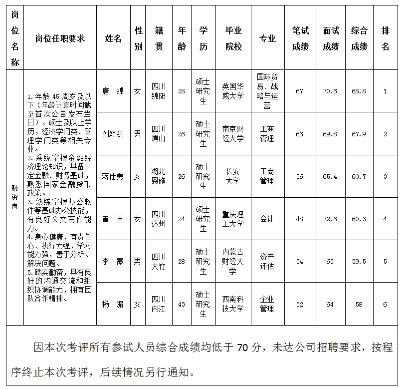 根據(jù)綿陽金控投資管理有限責(zé)任公司發(fā)布的招聘公告及招聘相關(guān)規(guī)定,經(jīng)筆試、面試等程序,現(xiàn)將筆試(面試)成績(jī)予以公示。