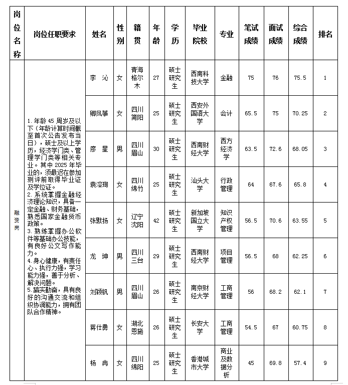 根據(jù)綿陽金控投資管理有限責(zé)任公司發(fā)布的招聘公告及招聘相關(guān)規(guī)定,經(jīng)筆試、面試等程序,現(xiàn)將筆試(面試)成績(jī)予以公示。