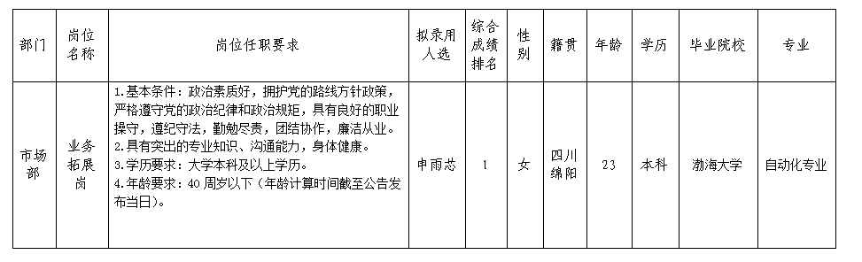 根據(jù)綿陽(yáng)市建設(shè)工程質(zhì)量檢測(cè)中心有限責(zé)任公司發(fā)布的招聘公告及招聘相關(guān)規(guī)定,經(jīng)筆試、面試、背景調(diào)查、體檢等程序,擬錄用申雨芯同志到綿陽(yáng)市建設(shè)工程質(zhì)量檢測(cè)中心有限責(zé)任公司工作,現(xiàn)予以公示,具體情況如下: