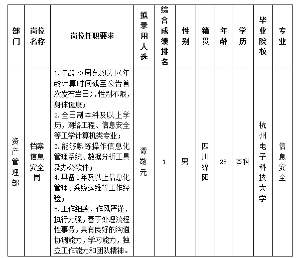 根據(jù)綿陽市綿投商業(yè)運營管理有限責任公司發(fā)布的招聘公告及招聘相關規(guī)定,經筆試、面試、背景調查、體檢等程序,擬錄用譚敬元同志到綿陽市綿投商業(yè)運營管理有限責任公司工作,現(xiàn)予以公示,具體情況如下:
