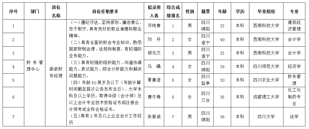 根據(jù)綿陽市投資控股(集團)有限公司發(fā)布的招聘公告及招聘相關(guān)規(guī)定,經(jīng)筆試、面試、考察等程序,擬錄用鄧純青等同志作為集團委派財務(wù)經(jīng)理崗位擬錄用人員,現(xiàn)予以公示,具體情況如下: