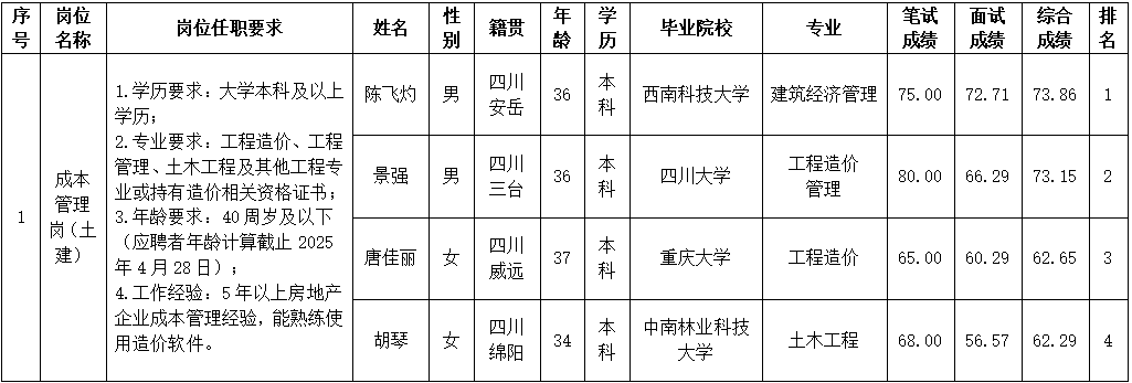根據(jù)綿陽市綿投置地有限公司發(fā)布的招聘公告及招聘相關規(guī)定,經(jīng)筆試、面試等程序,現(xiàn)將筆試、面試成績予以公示。