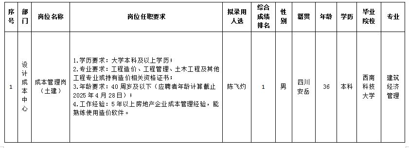 根據(jù)綿陽市綿投置地有限公司發(fā)布的招聘公告及招聘相關(guān)規(guī)定,經(jīng)筆試、面試、考察、體檢等程序,擬錄用陳飛灼同志到綿陽市綿投置地有限公司工作,現(xiàn)予以公示,具體情況如下: