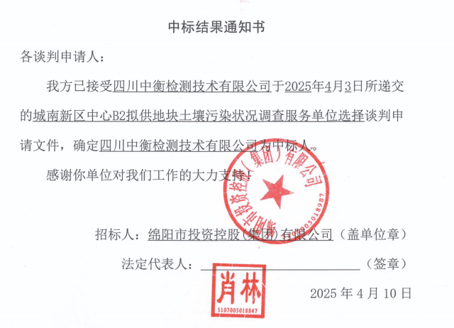 城南新區(qū)中心B2擬供地塊土壤污染狀況調(diào)查服務(wù)單位選擇中標(biāo)結(jié)果通知書